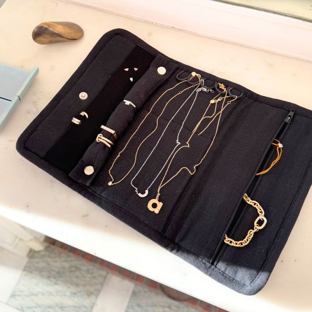 Dotée de compartiments rembourrés pour éviter les chaînes emmêlées et les boucles d’oreilles égarées, elle a été pensée comme un écrin sûr et raffiné. Ensemble, nous avons imaginé le compagnon de voyage idéal : pratique, élégant et durable.