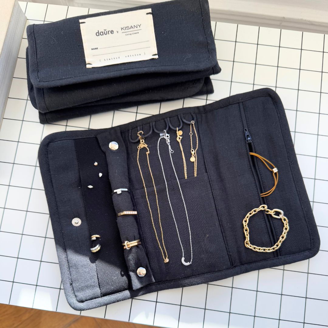 daŭre : Nous avons toujours admiré l’engagement de KISANY en faveur de l’autonomisation des femmes et la beauté de leur travail. Lorsqu’elles nous ont proposé une collaboration, nous avons immédiatement pensé à une trousse à bijoux à la fois chic et pratique. Nous savions que KISANY serait le partenaire idéal : leurs créations racontent des histoires, et nous voulions que cette trousse en fasse partie.