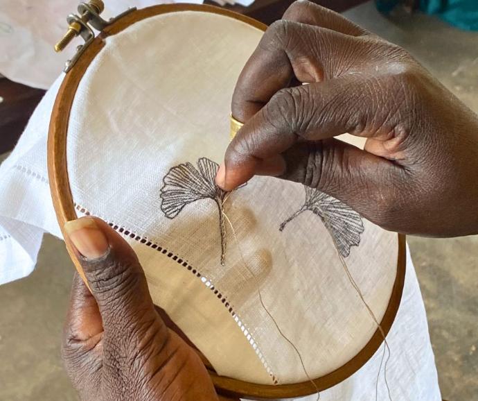 - Fabrication artisanale : chaque création est délicatement brodée à la main par des artisanes qualifiées au Rwanda et en République démocratique du Congo.